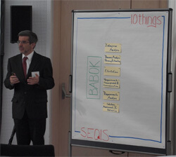 Den Auftakt der Veranstaltungsserie machte Josef Falk mit seiner Einführung in den BABOK-Guide®. Der „Business Analysis Body of Knowledge®“ – kurz BABOK®-Guide wird herausgegeben vom „International Institute of Business Analysis™“ und fasst die Best Practices auf diesem Gebiet zusammen. Der SEQIS Consultant Falk ist einer von bislang erst fünf „Certified Business Analysis Professionals™“(CBAP) in Österreich. Der Profi gewährte seinem Publikum Einblicke in den weltweit anerkannten Standard für die Tätigkeiten in der Business Analyse.