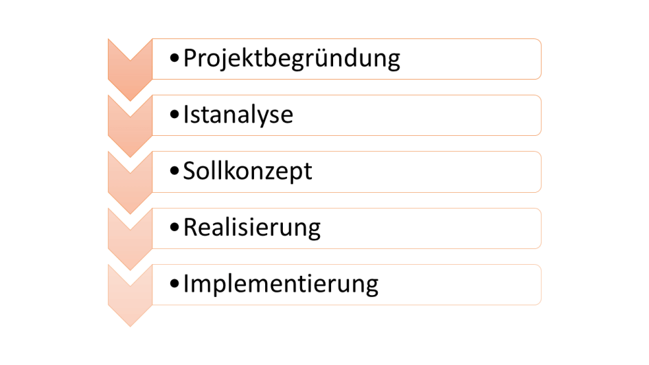 Nach dem Schritt "Projektbegründung", in dem das Projekt gestartet wird, wird der aktuelle Zustand des Arbeitsgebietes aufgenommen und analysiert. Auf diesem aufbauend wird das zukünftige System entworfen - es wird ein "Sollkonzept" erstellt. Dieses wird im Anschluss realisiert, d.h. konkret, es wird die Software entwickelt. Unter Implementierung wird dann schließlich die Inbetriebnahme des neuen Systems verstanden.