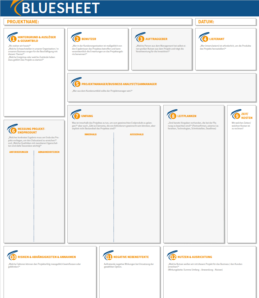 Anmerkungen und Ausfüllhilfen stehen in den jeweiligen „tiles“ des Bluesheets-Templates. Bei der Erstellung eines Business Case sollte zusätzlich folgendes sichergestellt werden: