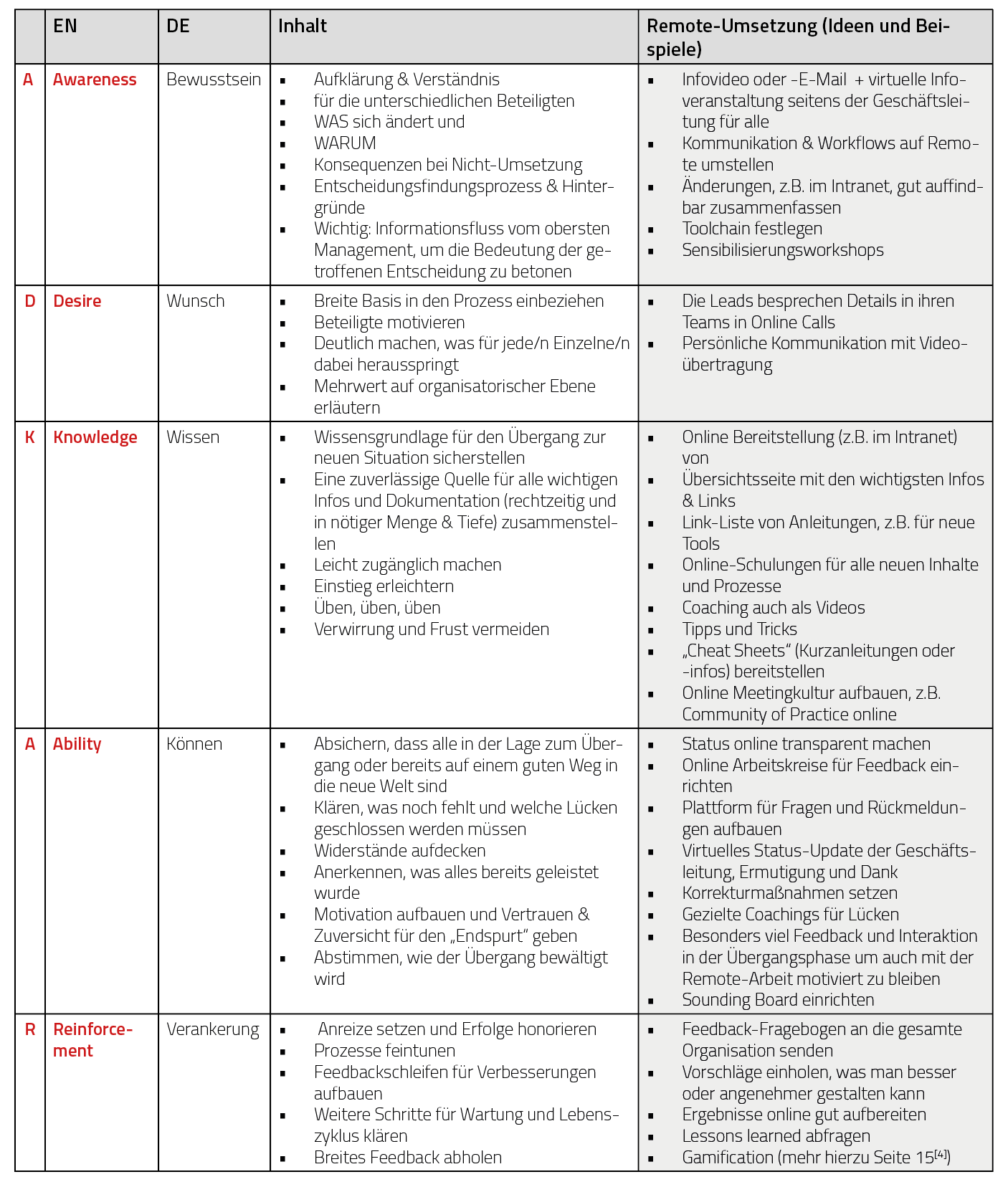 CM geht proaktiv von Problemen aus und wirkt wie ein Gleitmittel, dass ein Projekt gut läuft. Es gibt viel mehr oder weniger umfangreiche Ansätze dafür. Hier exemplarisch das erprobte Prosci ADKAR Model[6], weil es einen guten und schnell umsetzbaren Rahmen darstellt, der auch Remote gut angepasst werden kann.