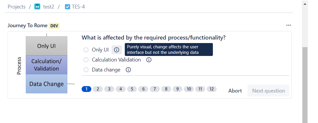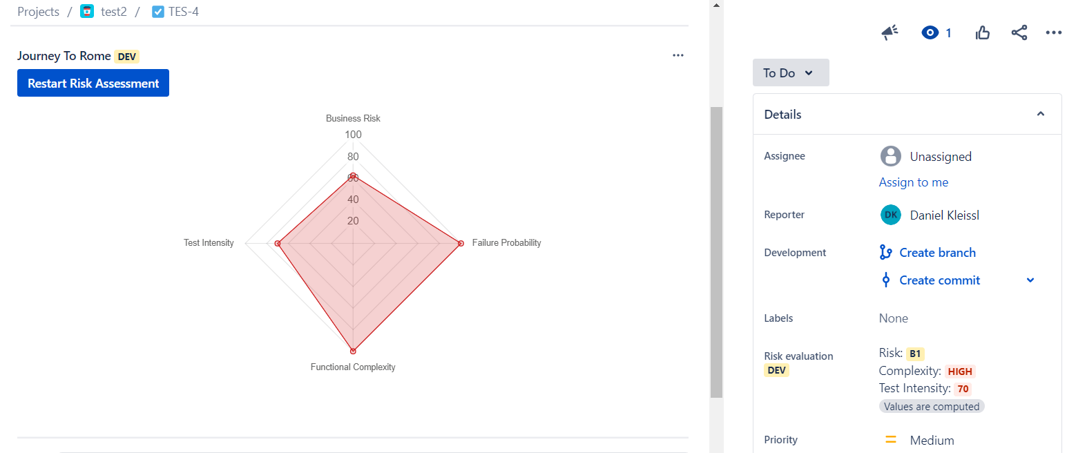 Bei der Reise nach Rom wird anhand von zwölf Fragen zu verschiedenen Bereichen eines Features und der zugrundeliegenden Software erhoben, wie sich das (Business)-Risiko dieses Features zusammensetzt. Die Antworten der Fragen wurden bisher in ein Excel-Sheet mit Makros eingetragen und damit die verschiedenen Risiko-Kennzahlen berechnet. Das Ziel des von uns entwickelten Plugins ist nun, diesen Prozess in einem intuitiven Wizard abzubilden, und somit über ein paar Klicks die Risikobewertung eines Feature-Tickets oder einer Anforderung vorzunehmen.