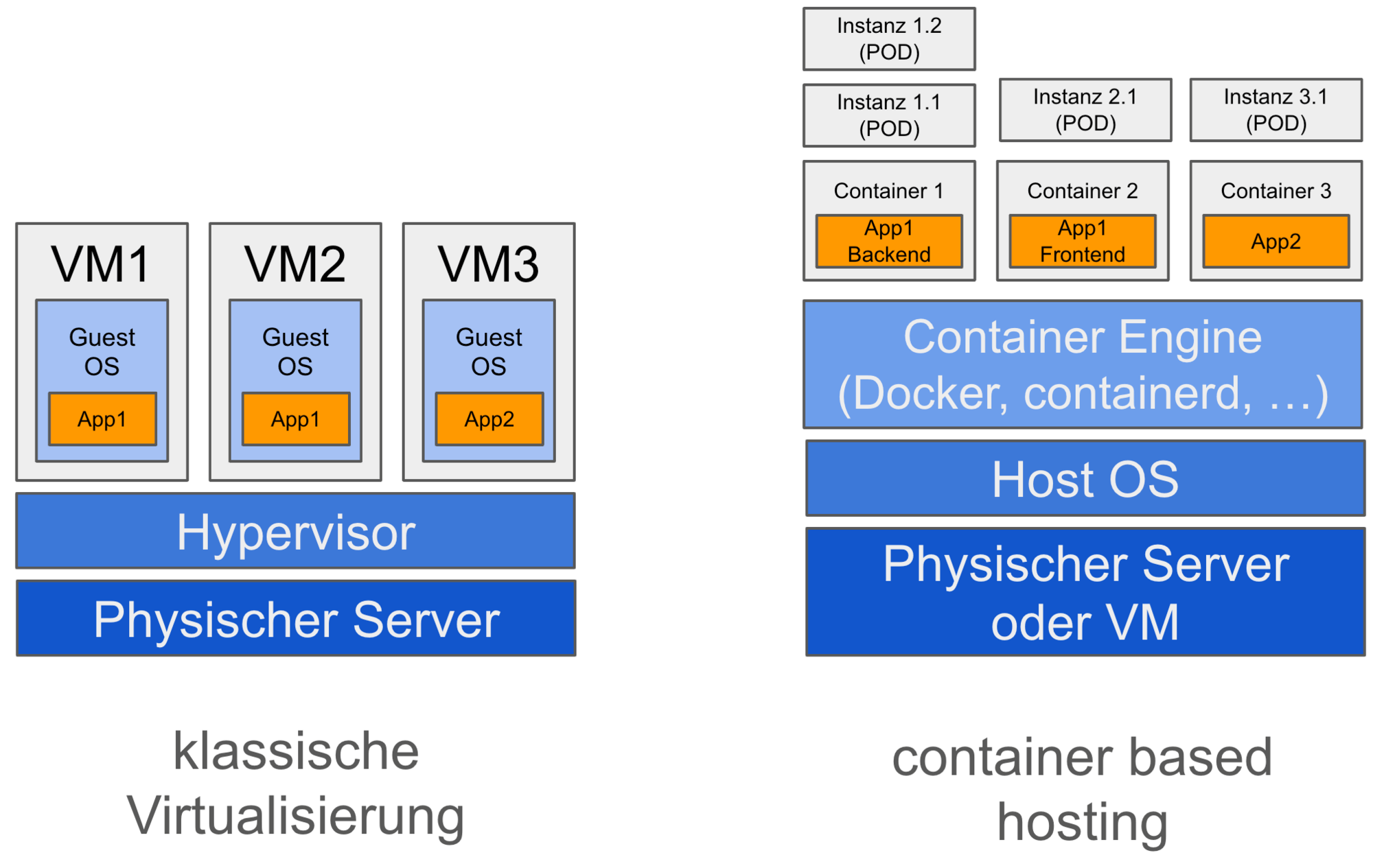 Ein großer und stark unterschätzter Unterschied zu Standard Virtualisierung ist die „Größe“ der virtuellen Maschinen bzw. Container: wurde früher das ganze Betriebssystem inkl. Web- und Applicationserver virtualisiert, teilt man die Applikation bei CBH in viele kleine(re) Komponenten (Container): da gibt es Container für die Datenbank, einen für das Backend der Hauptanwendung, einen für das Admin-Interface, einen für das Customer-Interface... Das bringt Flexibilität, aber auch Komplexität mit sich.