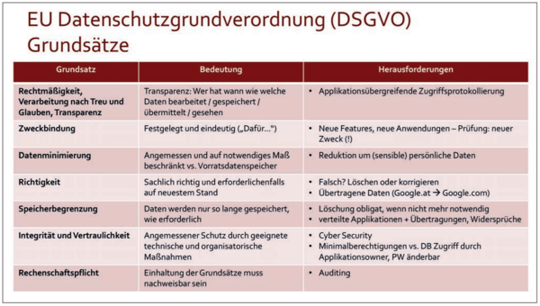 Mit der DSGVO wurden eine Menge Grundsätze verabschiedet, die große Herausforderungen mit sich bringen (siehe Abbildung 4). Viele IT Lösungen müssen diese Anforderungen erst implementieren – falls das überhaupt (sinnvoll) möglich ist (Stichwort Legacysysteme). Darüber hinaus kommen auch neue Rollen und Verantwortlichkeiten ins Spiel – beide Punkte münden in ein Basisproblem: Wer soll das machen? Datenschutzbeauftragte mit IT Kenntnissen und noch mehr Analysten, Entwickler und Tester für die Aktualisierung – und dies vor dem Hintergrund der mangelhaften Verfügbarkeit von IT Spezialisten in der EU!