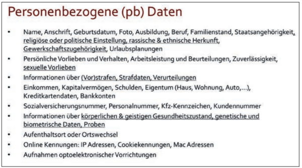 ... sind alle Informationen, die sich auf bereits identifizierte oder identifizierbare natürliche Personen beziehen (Anm: Juristische Personen sind ausgenommen – allerdings wird aktuell der Bezug zwischen den Vertretern der juristischen Personen und deren schützenswerte Daten diskutiert; hier werden wohl auch noch Handlungsdirektiven kommen).