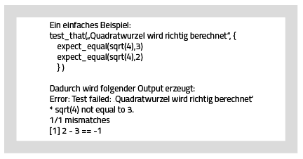 Dieser Test besteht aus einem Testnamen und den zu testenden Code zuzüglich seines erwarteten Ergebnisses. Ein Vorteil dieses packages ist, dass, wenn der Test fehlschlägt, man am Output die Ursache erkennen kann, wie auch am Beispiel zu erkennen ist. Die 2. Zeile liefert keinen Output, da sie korrekt ist, das Ergebnis entspricht dem erwarteten Wert.