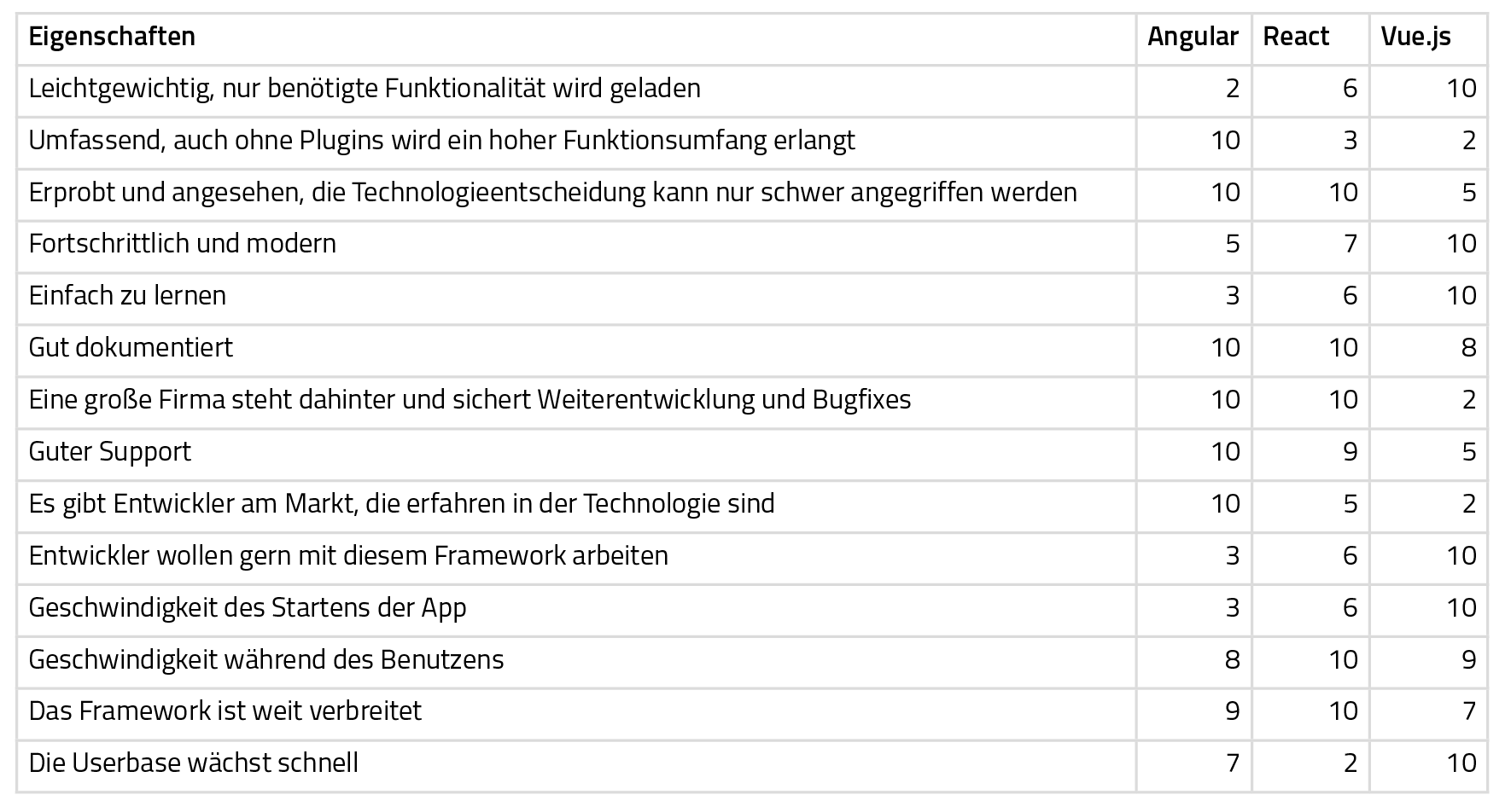 Ich habe mir eine Tabelle überlegt, die Ihnen vielleicht bei der Entscheidung zwischen den Frameworks hilft. Überlegen Sie sich, wie wichtig die einzelnen Eigenschaften für Sie sind und bestimmen Sie einen Faktor dafür (0 - unwichtig bis 3 - sehr wichtig) und multiplizieren Sie die Werte in der entsprechenden Zeile damit. Dann addieren Sie die Werte für jedes Framework und das mit den meisten Punkten ist ein guter Kandidat als Basistechnologie für ihre Progressive Web App.