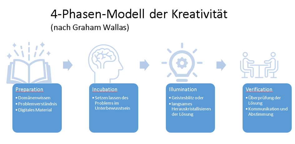 Es gelten jedoch auch hier die allgemeinen Regeln für kreative Prozesse, wie sie unter anderem von Graham Wallas [1] beschrieben wurden. Demgemäß besteht ein kreativer Prozess aus vier Schritten: