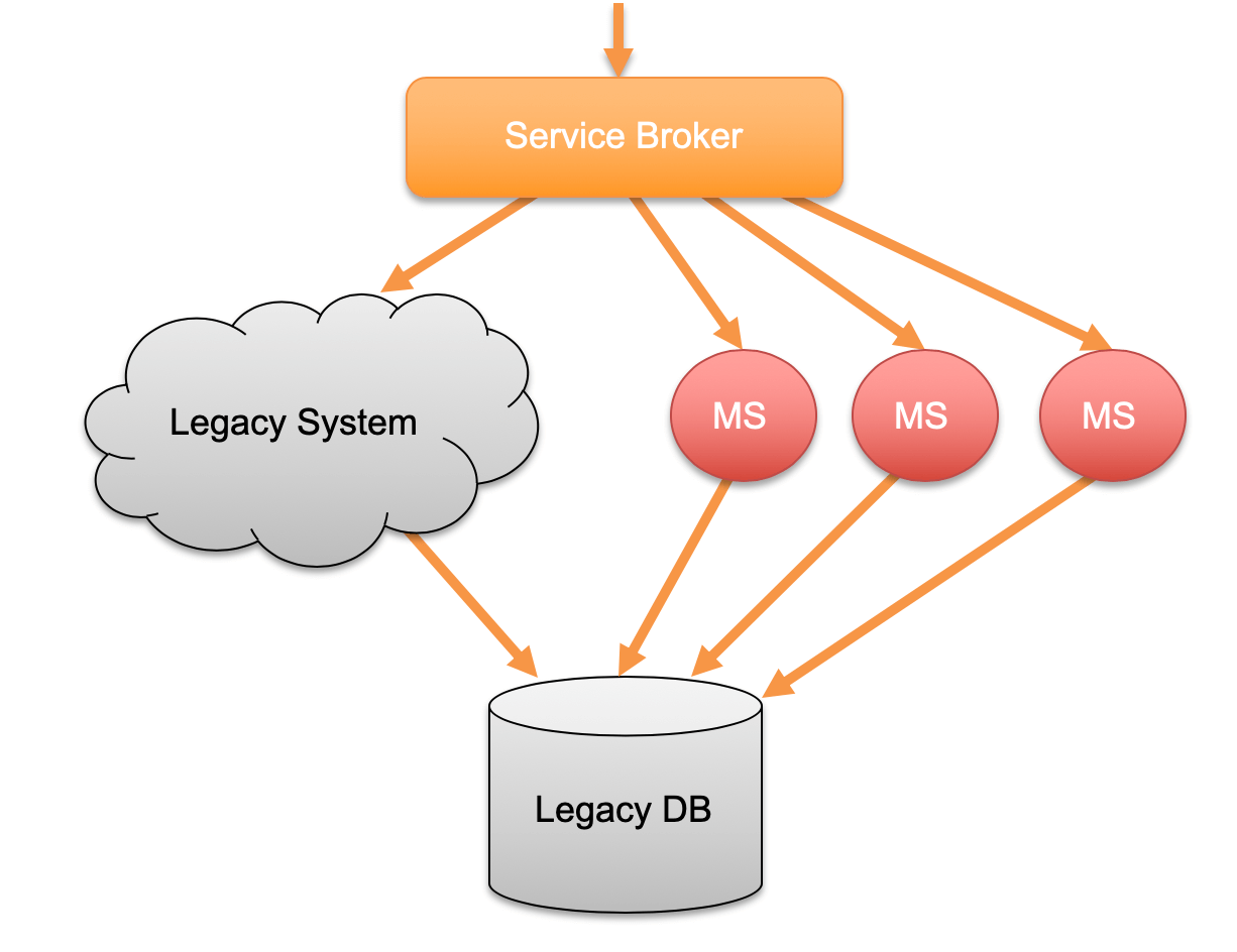 Steht diese Architektur aber grundlegend, kann das Legacy System schrittweise abgelöst werden. Dafür eignet sich oft eine auf MicroServices basierende Lösung: das Legacy System wird in funktional zusammenhängende Cluster unterteilt, die jeweils durch ein MicroService abgebildet werden. Die einzelnen MicroServices können direkt, oder bei Bedarf über die neue Middleware, kommunizieren. Die neue Lösung ersetzt also schrittweise das Legacy System, bis alle (notwendigen) Funktionen übernommen wurden und das Legacy System deaktiviert werden kann.