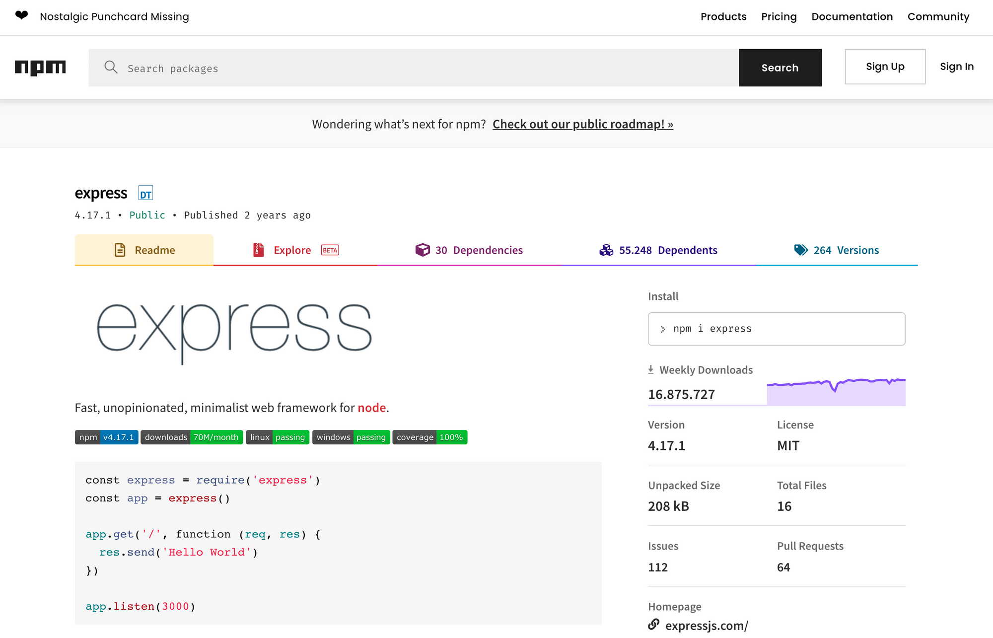 Am Beispiel von express sieht man, wie intensiv Node.js bereits weltweit genutzt wird. Das Framework express ermöglicht es extrem effizient einen Webserver aufzubauen und ist deshalb weit verbreitet. Aktuell wird es rund 16 Millionen mal pro Woche heruntergeladen und verwendet. So wie express gibt es Millionen von Frameworks, für so ziemlich jede Problemstellung, die sich bei der Entwicklung von Backends oder Microservices stellen.
