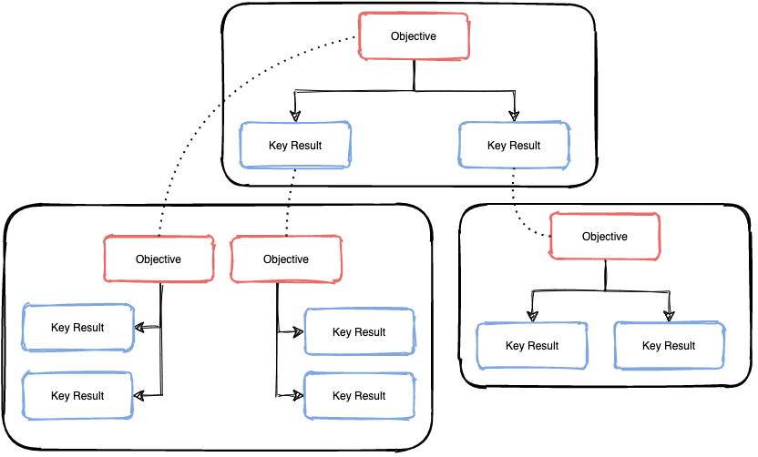 - Diese OKRs dienen zusammen mit dem Unternehmensleitstern als Inspirationsquelle für die Objectives des Fachbereichs oder der Teams, jeweils mit eigenen Key Results. Auch diese werden veröffentlicht. Objectives können von Ebenen darüber übernommen werden