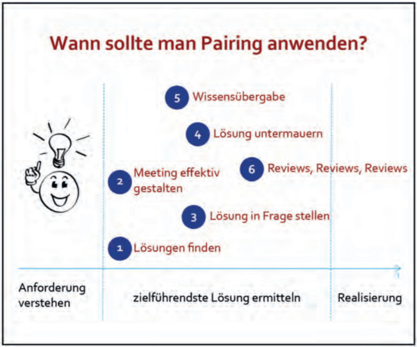 Ist Pairing wirklich immer sinnvoll? Nein, denn es gibt Situationen, in denen Pairing nicht zielführend ist. Ist eine Lösung bereits vordefiniert oder benötigt man selbst erst einmal Zeit um nachzudenken und das Problem zu strukturieren, macht Pairing zu diesem Zeitpunkt keinen Sinn. Ein weiterer Grund, warum Pairing nicht universal in jeder Situation eingesetzt werden kann: Es gibt Kollegen, mit denen man aufgrund zu unterschiedlicher Arbeitsweisen nicht zusammenarbeiten kann und keinen gemeinsamen Lösungsweg findet. In diesem Fall sollte ein neuer Pairing Partner gesucht bzw. andernfalls auf Pairing verzichtet werden.