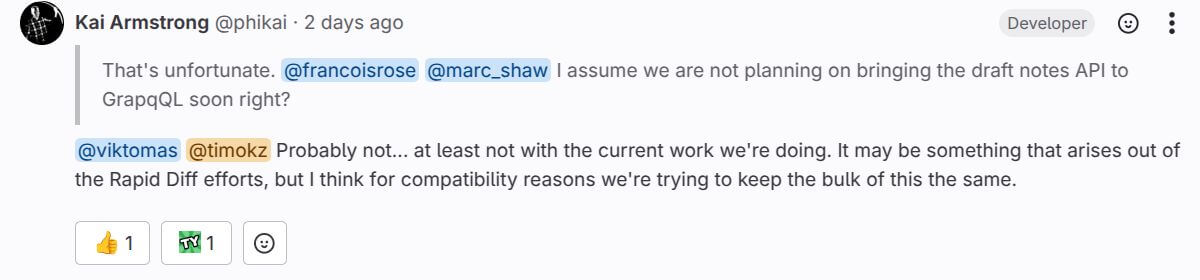Abbildung 2: Auch ist es nicht geplant Draft Notes über die GraphQL API anzubieten (Quelle: https://gitlab.com/gitlab-org/gitlab-vscode-extension/-/merge_requests/2390)