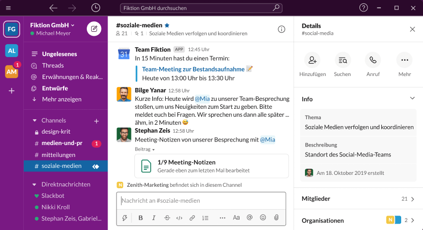 - Erstellung von Channels und Gruppen: Durch selbst definierte Gruppen können Mitglieder eines Teams eingeladen und diese gleichzeitig benachrichtigt werden.