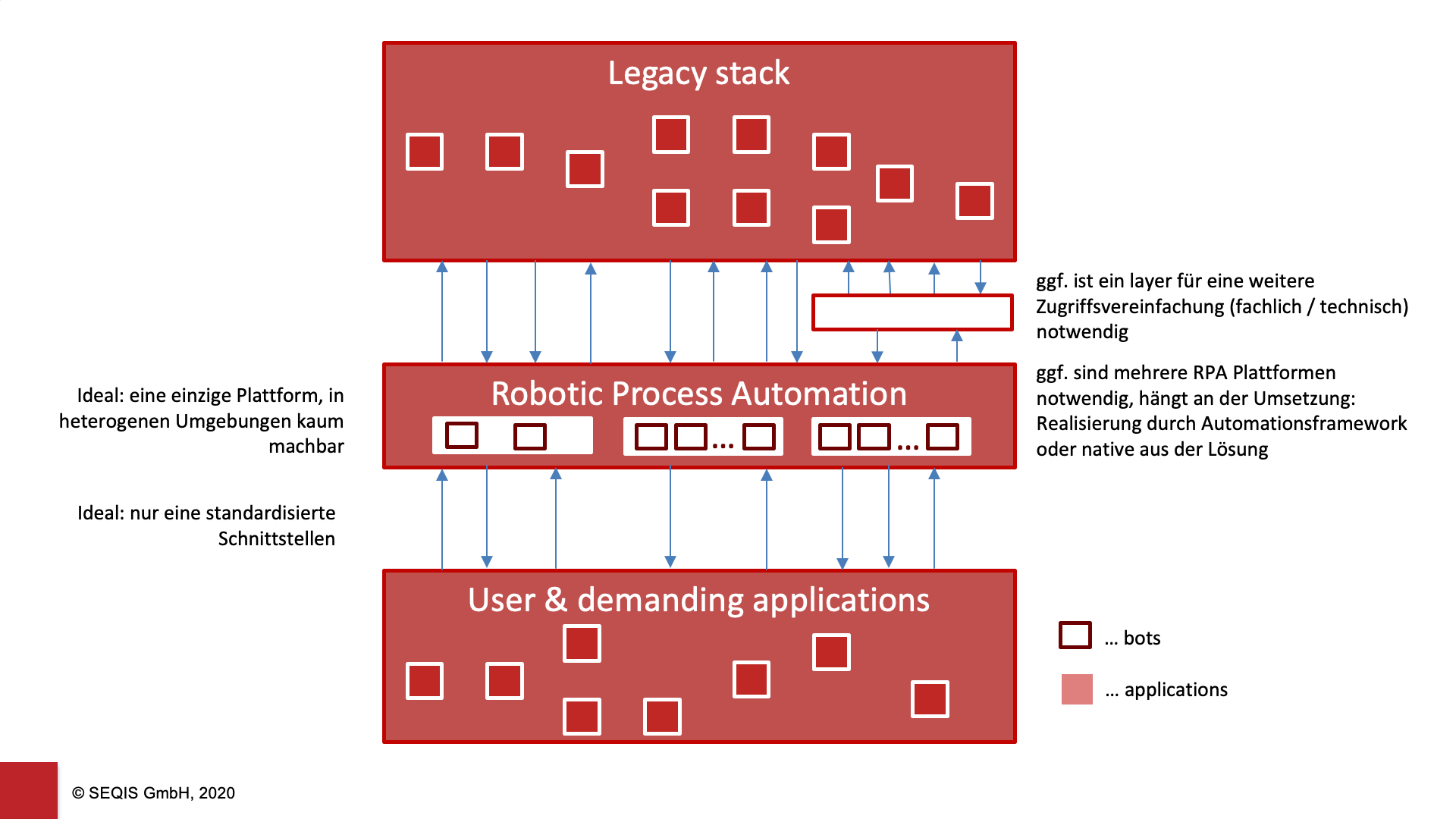 RPA ist ein Interaktions-Layer zur Steuerung vorhandener Anwendungen. RPA-Funktionen bestehen im Regelfall aus Screen Capture und record-and-replay Mechanismen, aufgepeppt durch Zeichenerkennung, Textanalysen (Intelligent RPA, Cognitive RPA) sowie der Möglichkeit Daten für die Verarbeitung aus anderen Quellen, z.B. Excel oder anfordernden Anwendungen, einzubinden.