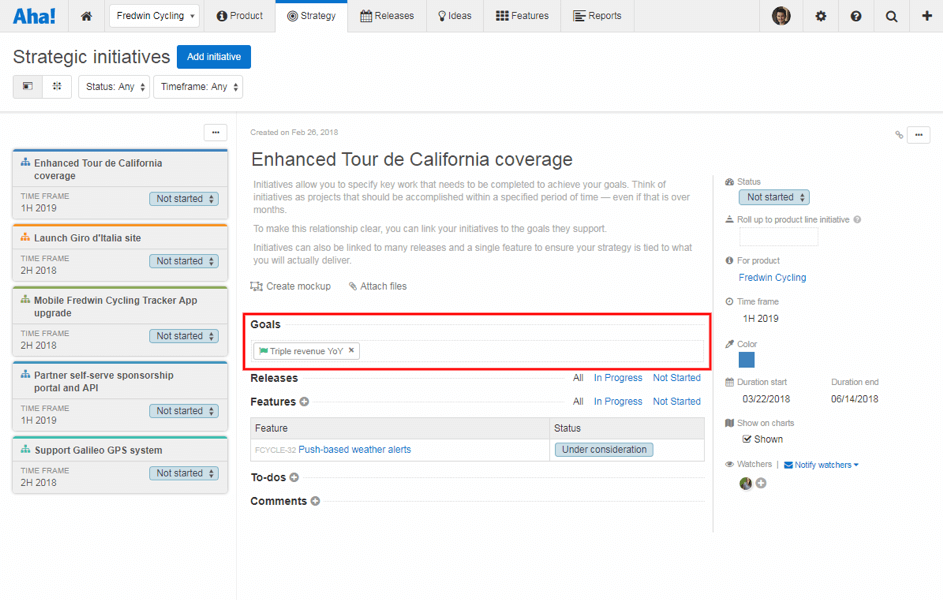 Aha! Erfassung der strategischen Produktinitiativen und der konkreten Ziele dahinter.