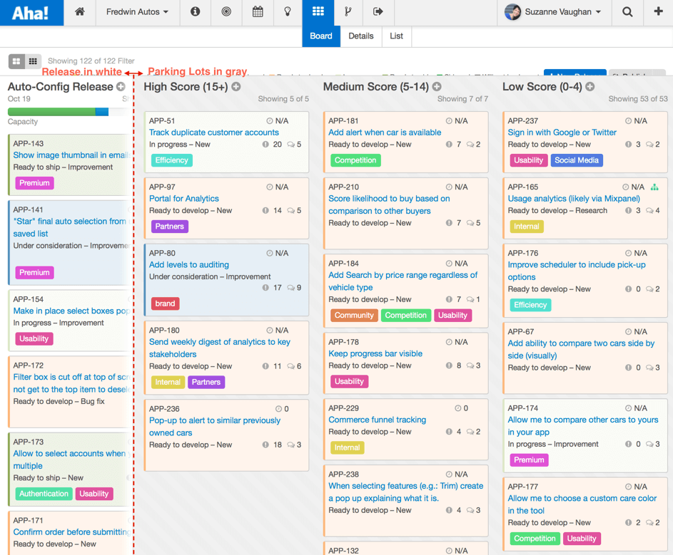 Aha! Parking Lots zeigen die ungeplanten Features am Featureboard automatisch gruppiert nach Feature Score