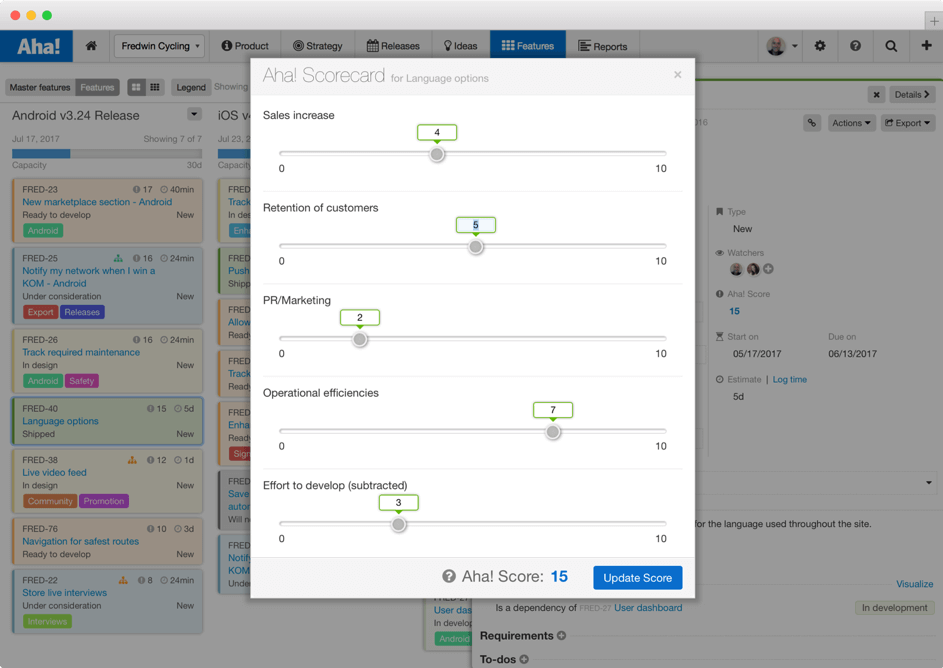 Eine Funktion, die das Produktmanagement stark vereinfacht ist die Aha! Scorecard. Sie ermöglicht Kriterien und Wertigkeiten zu definieren und so die Berechnung einer Business Value zu vereinfachen. Man kann eigene Scorecards und Berechnungen konfigurieren und so wirklich den Kundenkontext abbilden.