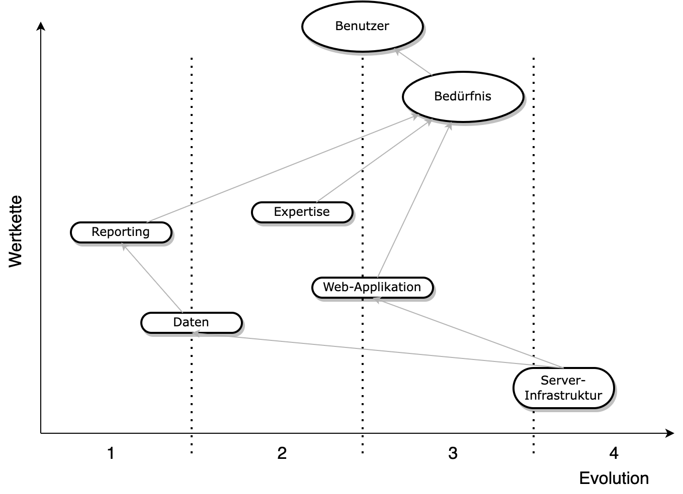 Mit unserer Wardley Map können wir nun bestimmte Fragen stellen und damit Potenziale offenlegen. Bei unserem hypothetischen Beispiel fällt auf, dass die Elemente „Reporting“ und „Daten“ sehr weit links stehen. Reporting ist in vielen Bereichen ein gelöstes Problem, es gibt Templates, Best Practices. Wenn der Rest der Welt ein Problem bereits gelöst hat, es für uns jedoch Neuland ist, kann dies wertvoll sein oder problematisch, und lohnt einen genaueren Blick.