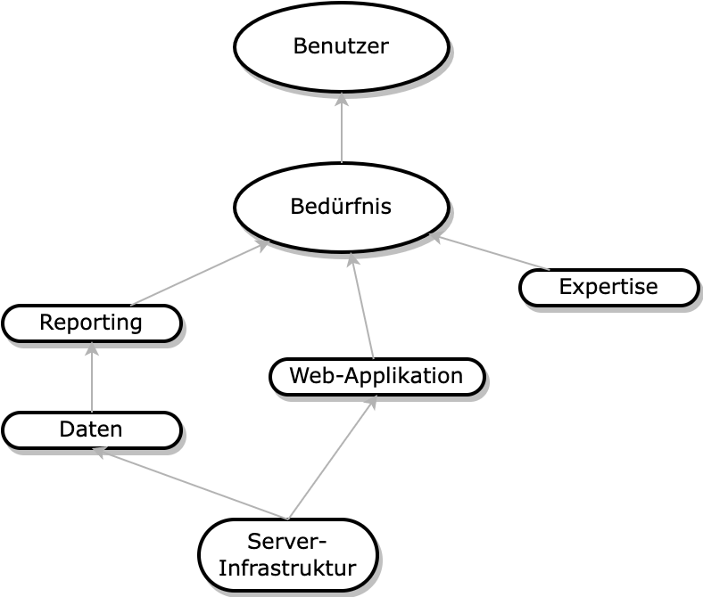 Wir ordnen die Elemente unserer hypothetischen Wertkette nun wie folgt an: Server-Infrastruktur ist „von der Stange“ und die Administration eine Kernkompetenz der Mitarbeiter. Die Web-Applikation läuft stabil, weist jedoch Usability-Mängel auf. Die Expertise der Benutzer ist stark verbesserungswürdig. Das benötigte Reporting ist komplettes Neuland und die Daten dafür werden händisch gesammelt und aufbereitet.