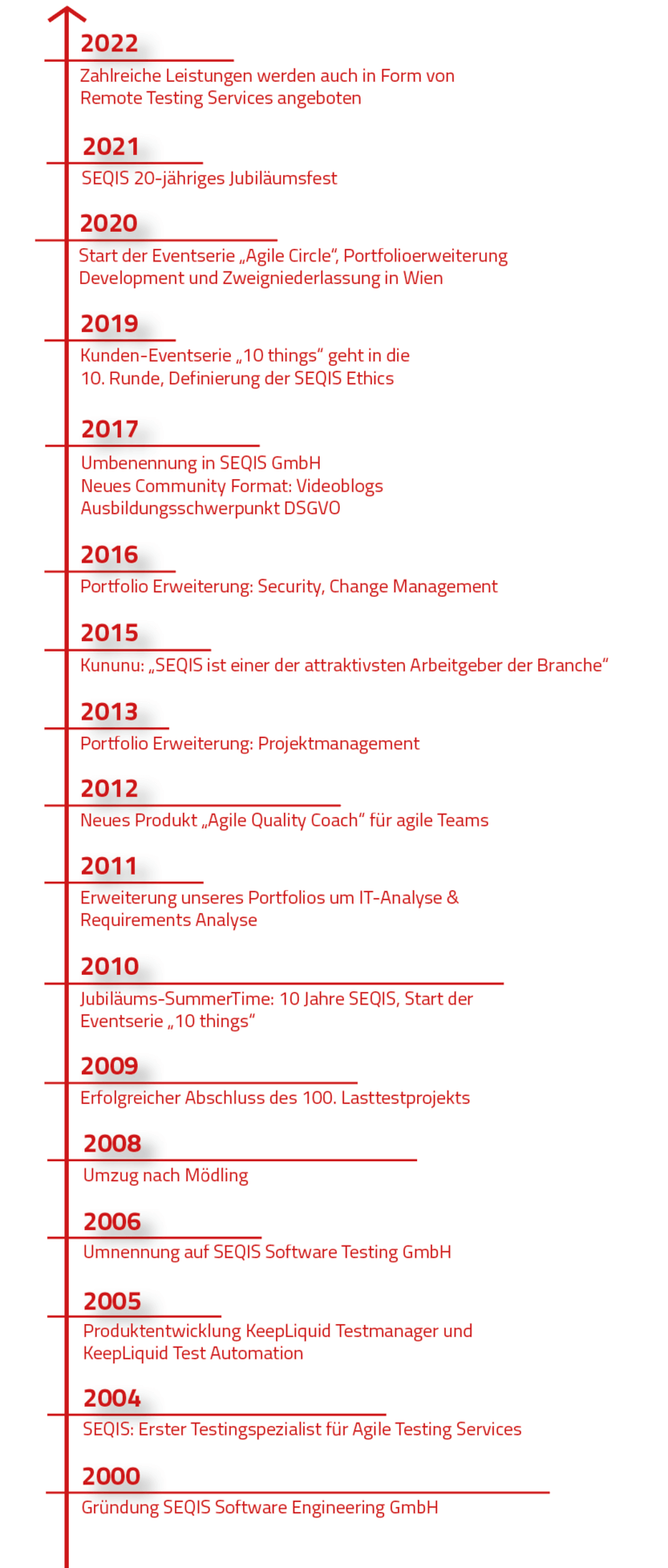 Die Geschichte von SEQIS begann 2001 in Perchtoldsdorf, als Alexander Vukovic die „SEQIS Software Engineering GmbH“ ins Leben rief. Von Anfang an zeichnete sich das Unternehmen durch sein Engagement und seine Expertise aus, was zur erfolgreichen Realisierung zahlreicher Projekte für namhafte nationale und internationale Partner führte. 2005 trat Alexander Weichselberger der Geschäftsleitung bei, was das Wachstum des Unternehmens weiter beschleunigte. Seit 2011 unterstützt auch Reinhard Salomon die Geschäftsleitung mit vollem Tatendrang. 2022 reagierte SEQIS auf die Anforderungen der modernen Arbeitswelt, indem zahlreiche Leistungen auch in Form von Remote Testing Services angeboten wurden. Dies ermöglichte es, Kunden noch flexibler und effizienter zu unterstützen, unabhängig von geografischen Distanzen.