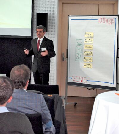 Mag. Josef Falk, Business Analyst bei SEQIS, gab in seinem Vortrag Einblicke in den Inhalt des weltweit anerkannten Standard in der Business Analyse, dem "Business Analysis Body of Knowledge®", kurz BABOK®-Guide. Dabei wurde besonderes Augenmerk auf Gemeinsamkeiten und Unterschiede zu anderen Standards gelegt.